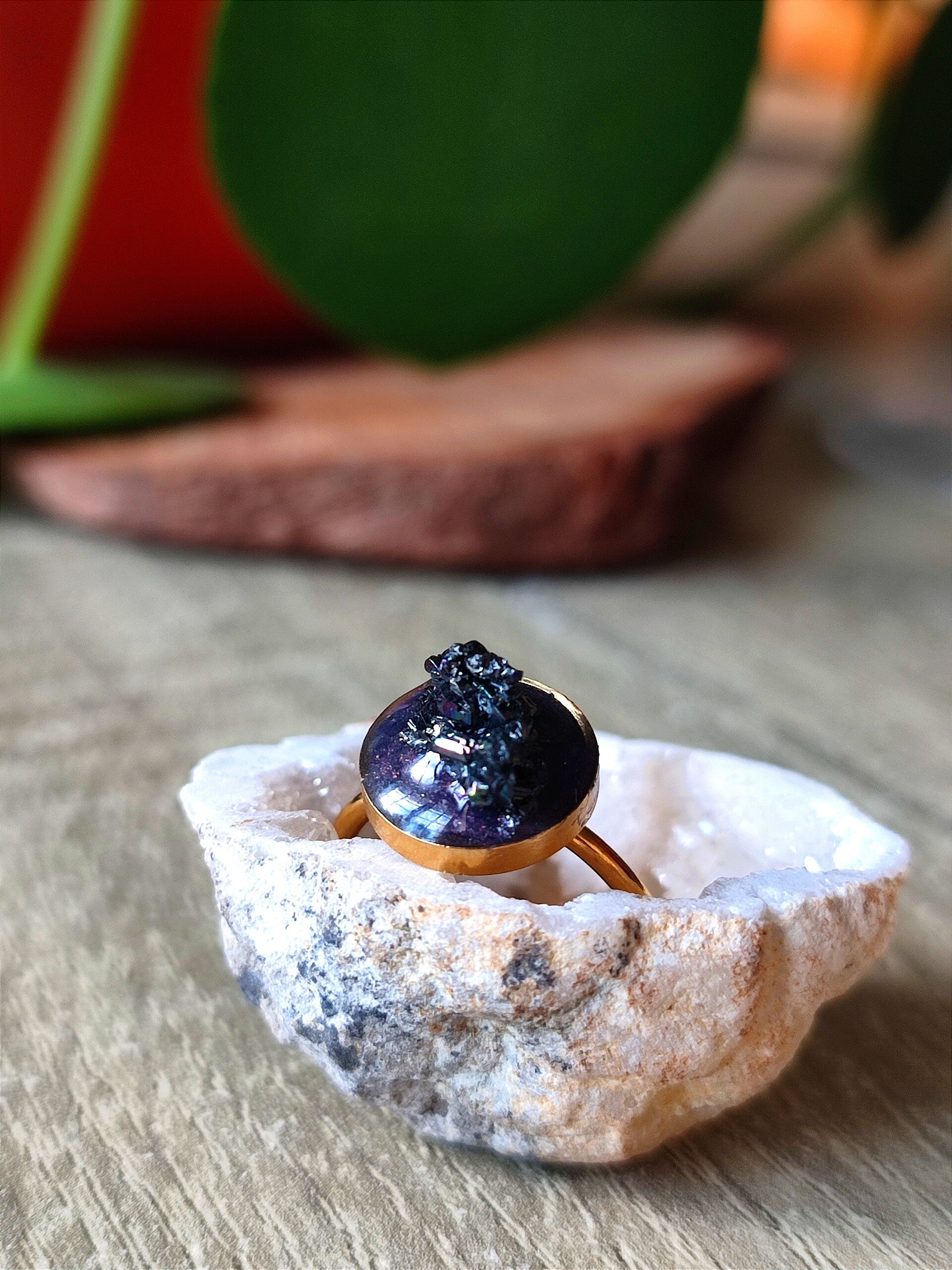 Cabochon réalisé à la main avec un mélange de résine, pigments violets avec des nuances et d'une Carborandite ou Moissanite Artificielle